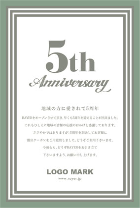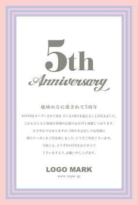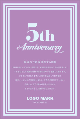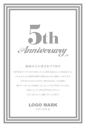 美容室・ネイルサロン・エステサロン・まつエクサロン・リラクゼーション向けの力強い直線のシンプルフレームのおしゃれな周年DMデザイン。 周年記念DMは、お客様に感謝の気持ちを伝える絶好の機会です。ダイレクトメールをお送りすることで顧客は自分が重要にされていると感じ、顧客満足度を向上できます! 周年記念DMには特別なプロモーションや割引クーポンを添付することで、リピート購買を促進できます。