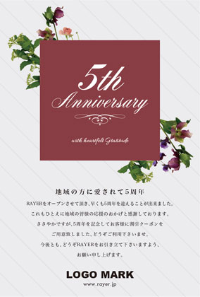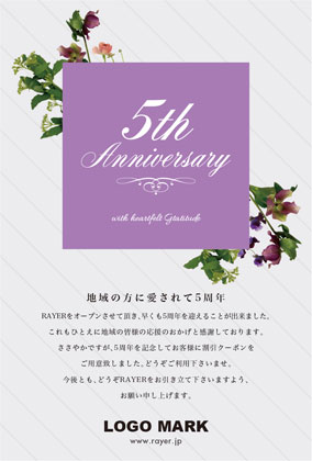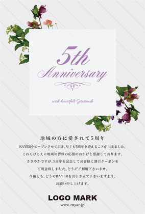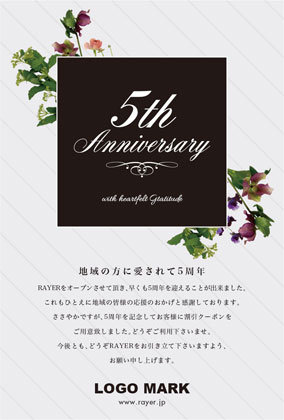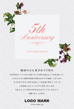 美容室・ネイルサロン・エステサロン・まつエクサロン・リラクゼーション向けのお花とストライプの落ち着いた雰囲気の大人可愛い周年DMデザイン。 周年記念DMは、お客様に感謝の気持ちを伝える絶好の機会です。ダイレクトメールをお送りすることで顧客は自分が重要にされていると感じ、顧客満足度を向上できます! 周年記念DMには特別なプロモーションや割引クーポンを添付することで、リピート購買を促進できます。