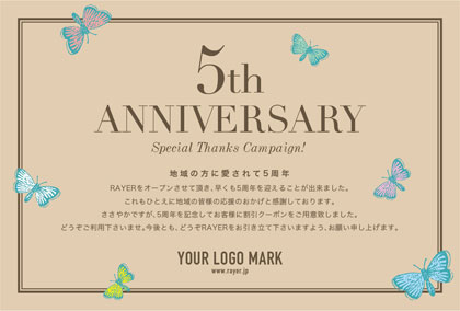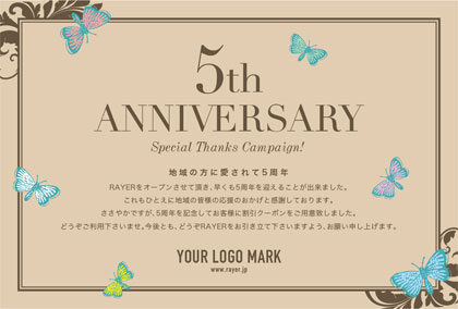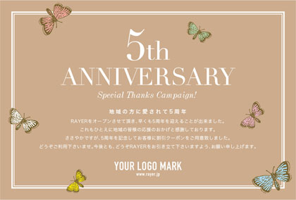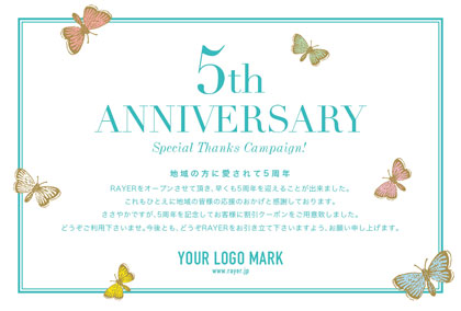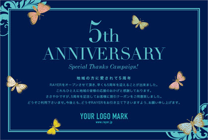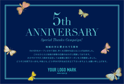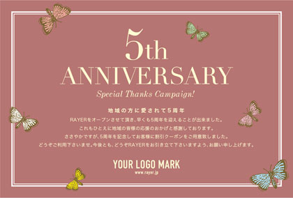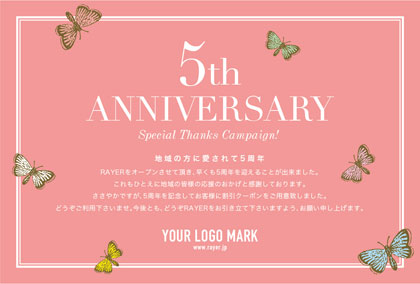 美容室・ネイルサロン・エステサロン・まつエクサロン・リラクゼーション向けの蝶が舞う華やかでゴージャスなデザインオシャレ!とっても可愛い周年DMデザイン。 周年記念DMは、お客様に感謝の気持ちを伝える絶好の機会です。ダイレクトメールをお送りすることで顧客は自分が重要にされていると感じ、顧客満足度を向上できます! 周年記念DMには特別なプロモーションや割引クーポンを添付することで、リピート購買を促進できます。
