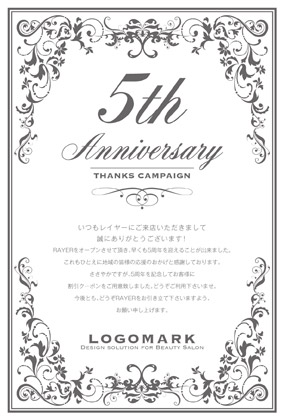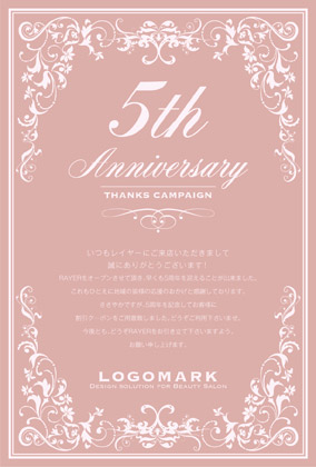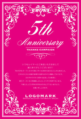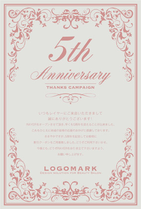 美容室・ネイルサロン・エステサロン・まつエクサロン・リラクゼーション向けのガーリーなお花のフレームだけどクラシカルな大人可愛いおしゃれな周年DMデザイン。 周年記念DMは、お客様に感謝の気持ちを伝える絶好の機会です。ダイレクトメールをお送りすることで顧客は自分が重要にされていると感じ、顧客満足度を向上できます! 周年記念DMには特別なプロモーションや割引クーポンを添付することで、リピート購買を促進できます。
