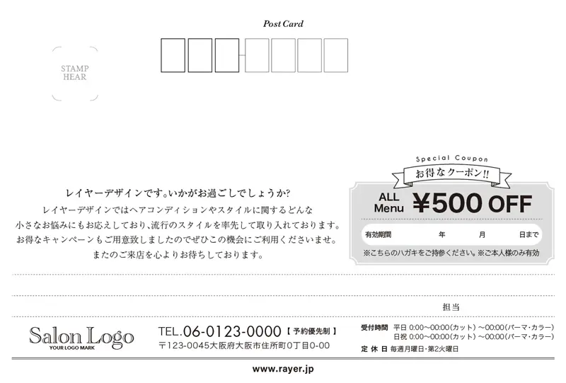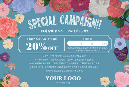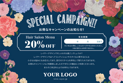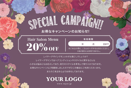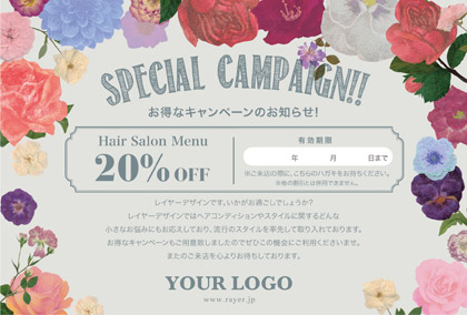 美容室・ネイルサロン・エステサロン・まつエクサロン・リラクゼーション向けの華やかでゴージャスな雰囲気!沢山の可愛いお花のアーチに包み込まれた失客対策再来店促進のおしゃれDMデザイン。 再来店促進DMには特別なプロモーションや割引情報を添付することで、顧客を再来店へ誘導。お得な情報があると、再びサロンを訪れる動機がより高まります。 また再来店促進DMを通じて、しばらくご来店のなかった顧客とのコミュニケーションを再度活発化させることができます。新しいサービスや最新のトレンドを紹介することで、顧客の興味を引くことができます。