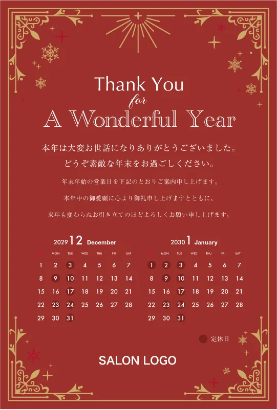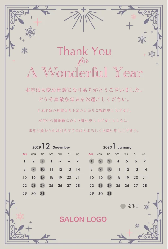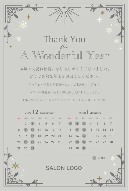 美容室・ネイルサロン・エステサロン・まつエクサロン・リラクゼーション向けの年末営業日カレンダー挨拶状。 シンプル・スター年末営業日カレンダー挨拶状。 控えめに散りばめられた星の装飾が美しい、ミニマルで洗練されたホリデーデザインです。シンプルながらも温かみのあるデザインで、現代的なセンスと親しみやすさを両立させ過度な装飾を避けた上品な年末営業日カレンダー挨拶状です。