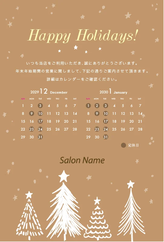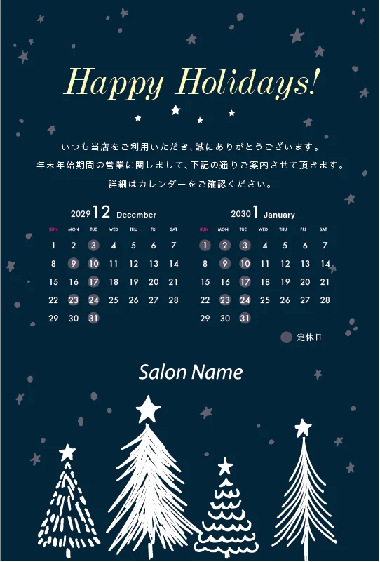 美容室・ネイルサロン・エステサロン・まつエクサロン・リラクゼーション向けの年末営業日カレンダー挨拶状。 シンプル・スター年末営業日カレンダー挨拶状。 控えめに散りばめられた星の装飾が美しい、ミニマルで洗練されたホリデーデザインです。シンプルながらも温かみのあるデザインで、現代的なセンスと親しみやすさを両立させ過度な装飾を避けた上品な年末営業日カレンダー挨拶状です。