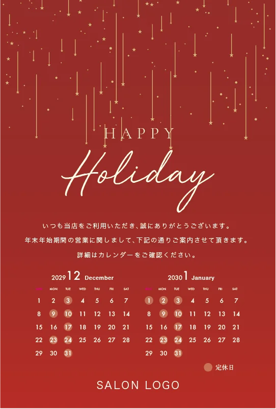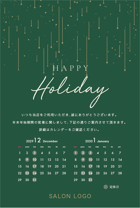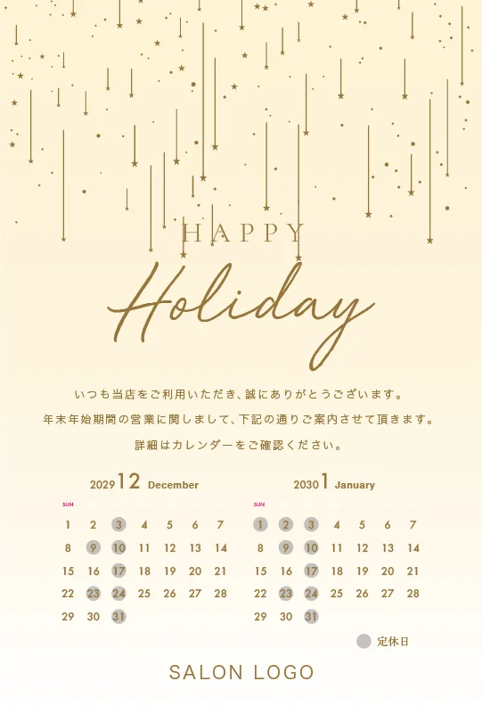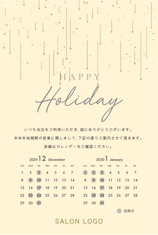 美容室・ネイルサロン・エステサロン・まつエクサロン・リラクゼーション向けの年末営業日カレンダー挨拶状。 シンプル・スター年末営業日カレンダー挨拶状。 控えめに散りばめられた星の装飾が美しい、ミニマルで洗練されたホリデーデザインです。シンプルながらも温かみのあるデザインで、現代的なセンスと親しみやすさを両立させ過度な装飾を避けた上品な年末営業日カレンダー挨拶状です。