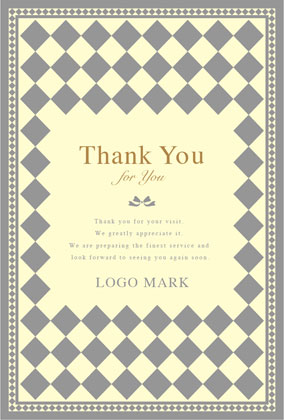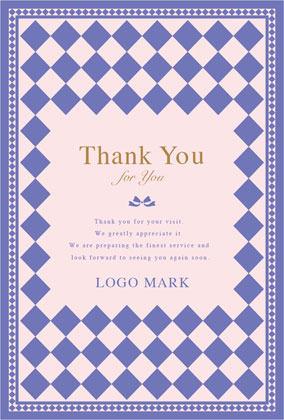 美容室・ネイルサロン・エステサロン・まつエクサロン・リラクゼーション向けのゴシック様式の市松模様のスクエアデザインがとってもかわいいオシャレお礼状DMはがき。 サロンにご来店頂いたお客様にお礼状を送りましょう!お礼状サンキューDMはブランドロイヤルティを高める一番の手段となります。顧客が特別な感謝の気持ちを受けることで、サロンに対する信頼感やサロンのファン心が向上します。