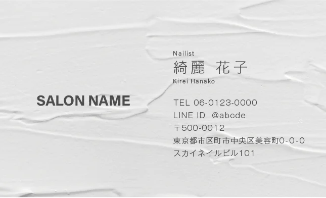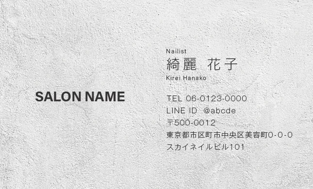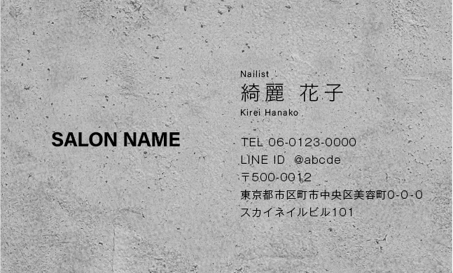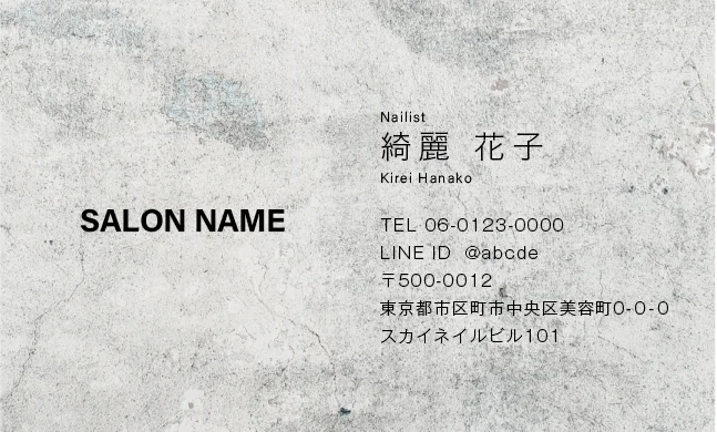 美容室・ネイルサロン・エステサロン・まつエクサロン・リラクゼーション向けのコンクリート背景のスタイリッシュで都会的、無機質だけど洗練されたクールなデザインのおしゃれな美容サロン名刺デザイン。