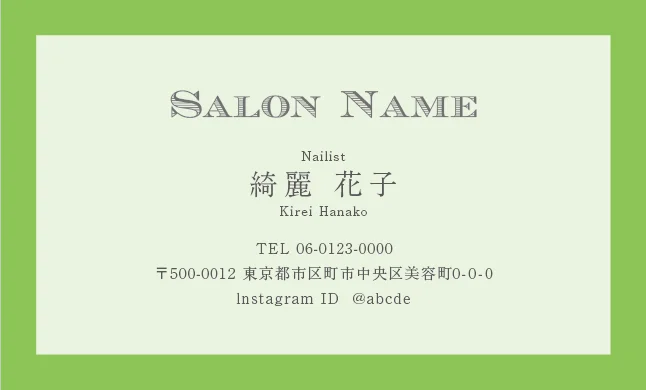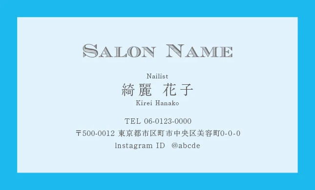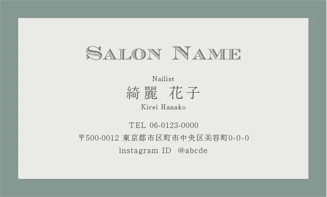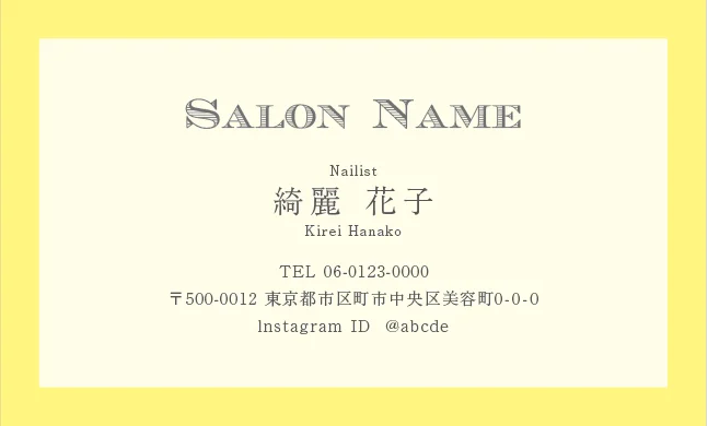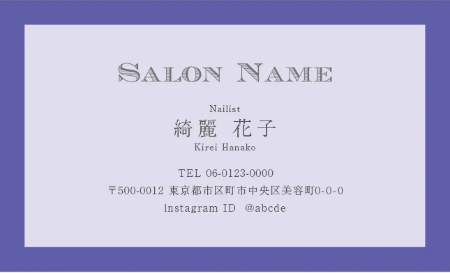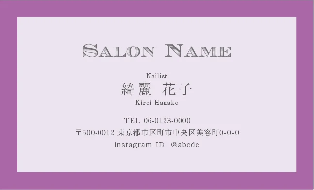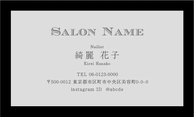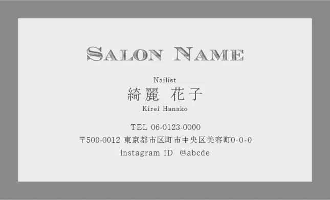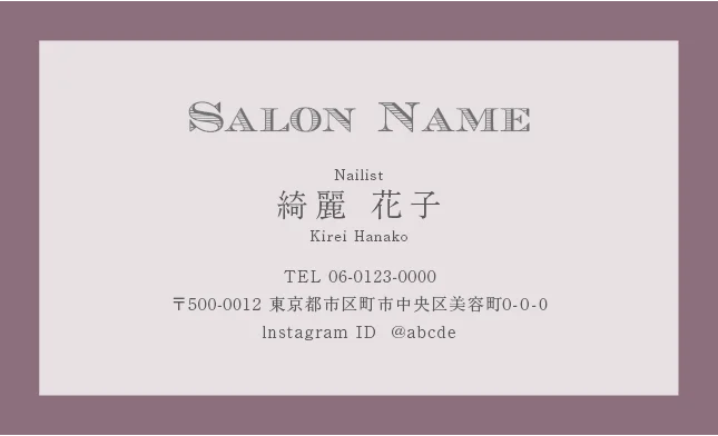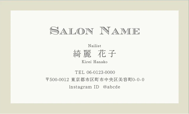 美容室・ネイルサロン・エステサロン・まつエクサロン・リラクゼーション向けのクラシック・ミニマル名刺テンプレート。トレンドに左右されない大人かわいい普遍的なおしゃれデザインで、長期的なブランド構築に貢献。シンプルさの中に込められた品格が、サロンの価値を静かに、しかし確実に伝えるおしゃれな美容サロン名刺デザイン。