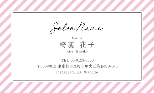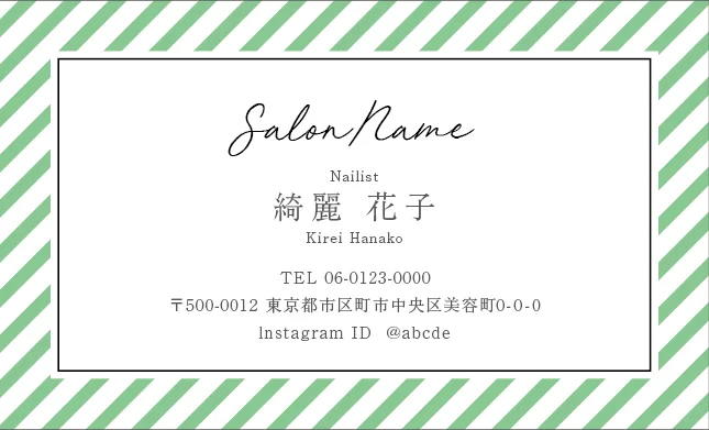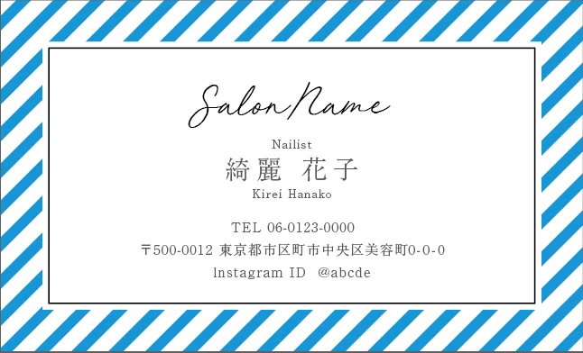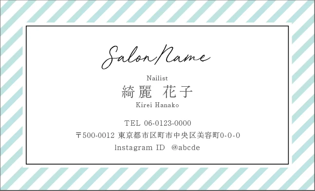 美容室・ネイルサロン・エステサロン・まつエクサロン・リラクゼーション向けの斜めストライプフレームが「元気」「フレッシュ」「親しみやすさ」を感じさせ、初めてのお客様でも気軽に来店できる明るいサロン雰囲気を選出する美容サロン名刺デザイン。