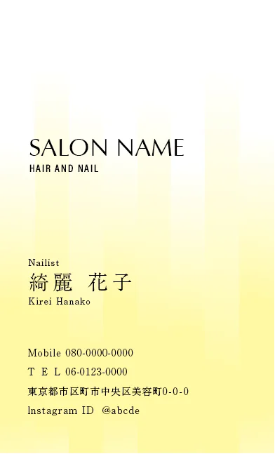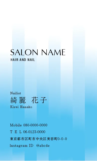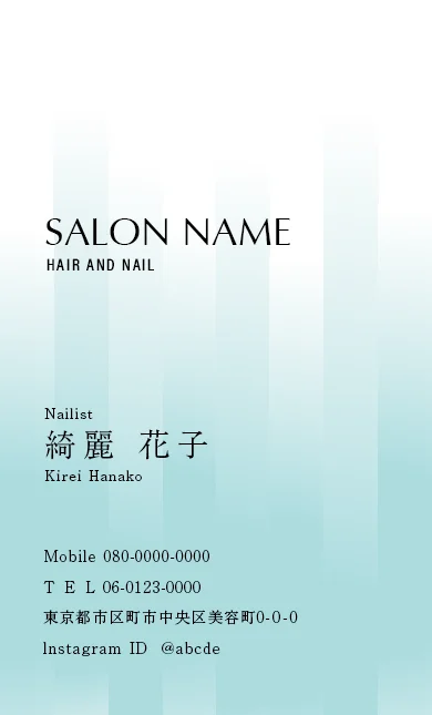 美容室・ネイルサロン・エステサロン・まつエクサロン・リラクゼーション向けの斜めストライプフレームが「元気」「フレッシュ」「親しみやすさ」を感じさせ、初めてのお客様でも気軽に来店できる明るいサロン雰囲気を選出する美容サロン名刺デザイン。