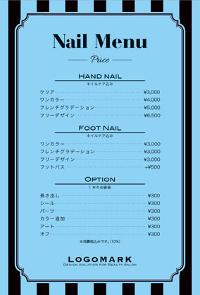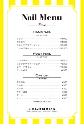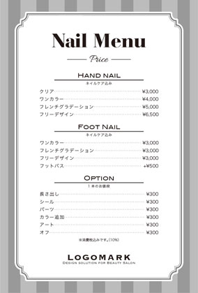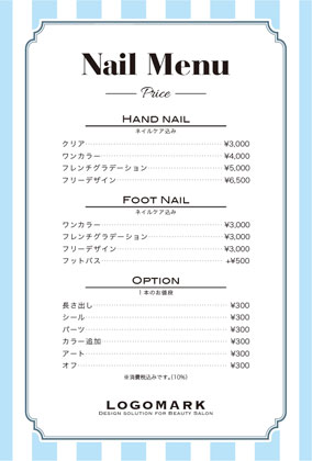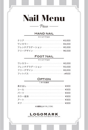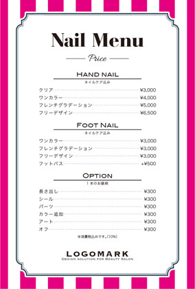 美容室・ネイルサロン・エステサロン・まつエクサロン・リラクゼーション向けのメニュー表ハガキサイズ。 コンサバな雰囲気の大人ガーリーな大きめのストライプが可愛いオシャレなメニュー表ハガキ。。オシャレなはがきサイズのメニュー表 価格表の制作いたします!
