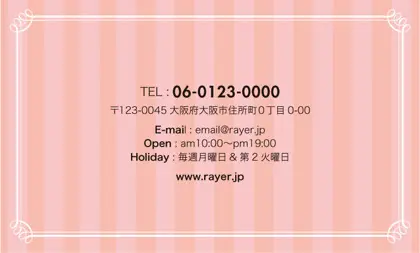 美容室・ネイルサロン・エステサロン・まつエクサロン・リラクゼーション向けの2折ポイントカード。 美容室やネイルサロン、エステサロンにぴったりな、ストライプ模様とお菓子箱の様なアンティーク枠が可愛らしいおしゃれな2折ポイントカードが登場しました。 2折ポイントカードデザインの特徴であるストライプとアンティーク枠が、上品で可愛い雰囲気を演出。 特別な美容の瞬間を提供を想像させる可愛いデザインの2折ポイントカードです。