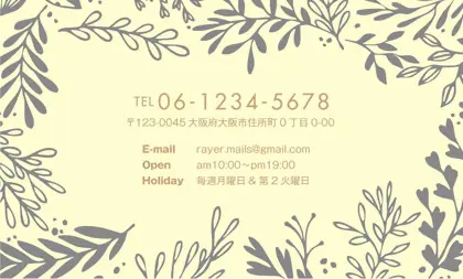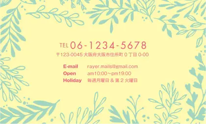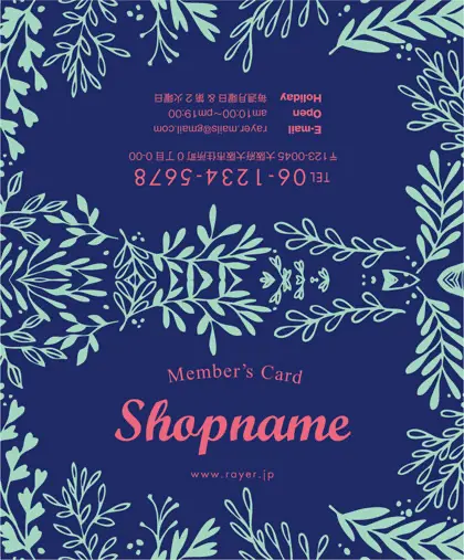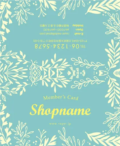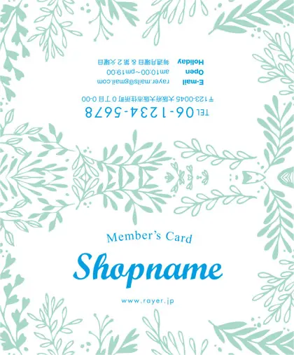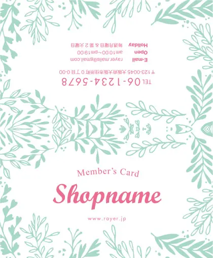 美容室・ネイルサロン・エステサロン・まつエクサロン・リラクゼーション向けの2折ポイントカード。 夏のリゾートを彷彿とさせる、かわいらしい2折ポイントカードが登場しました。グリーンな植物が自然感あふれ、四方から広がる草のパターンが爽やかで夏らしい2折ポイントカードデザイン特徴です。 爽やかで夏っぽい雰囲気が漂い、美容室やネイルサロン、エステサロンに訪れるお客様にリラックス感と特別な美容の時間をが想像できる2折ポイントカードデザインです。
