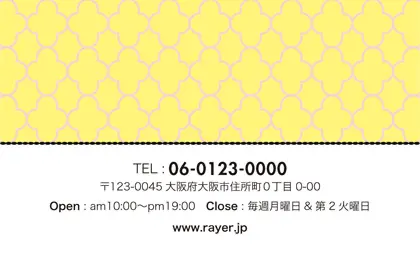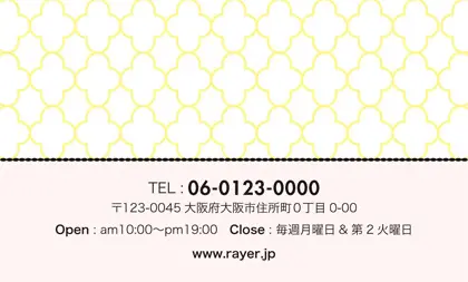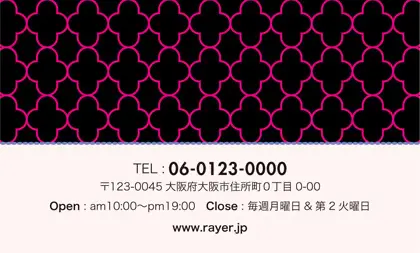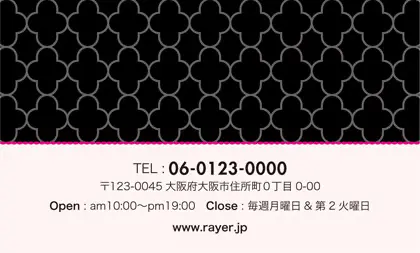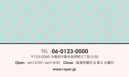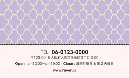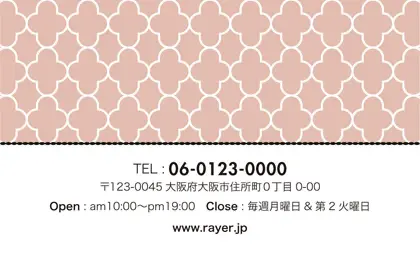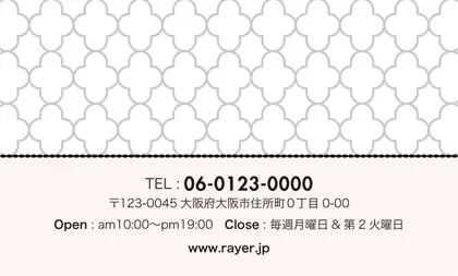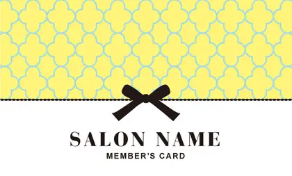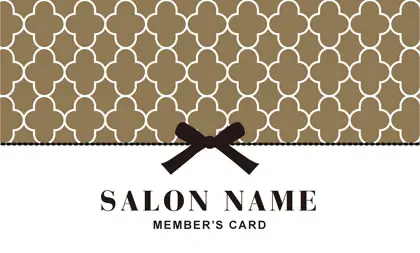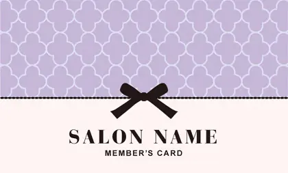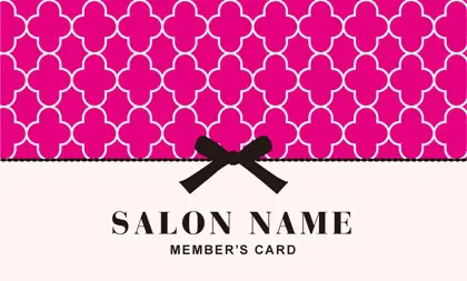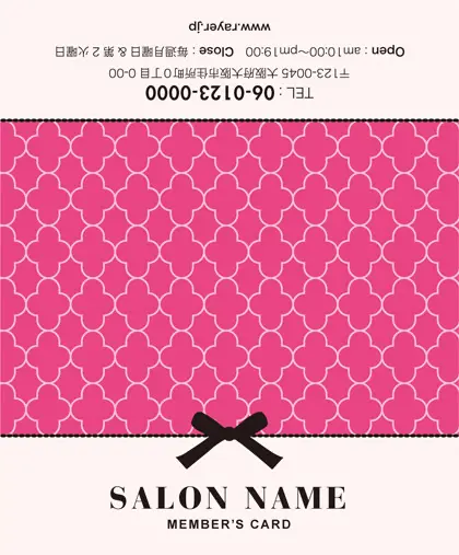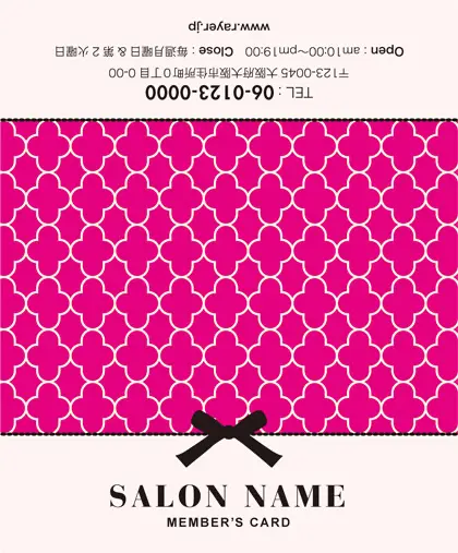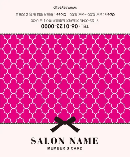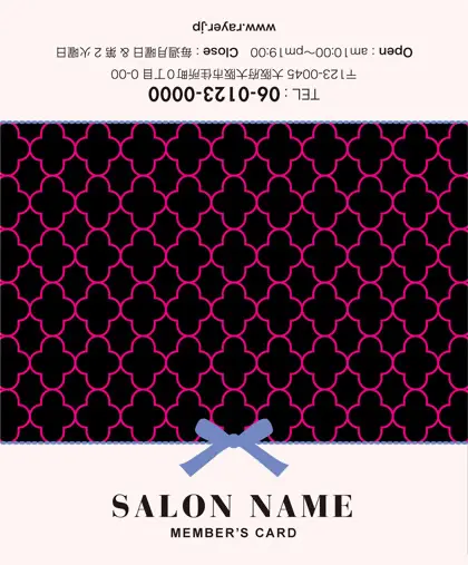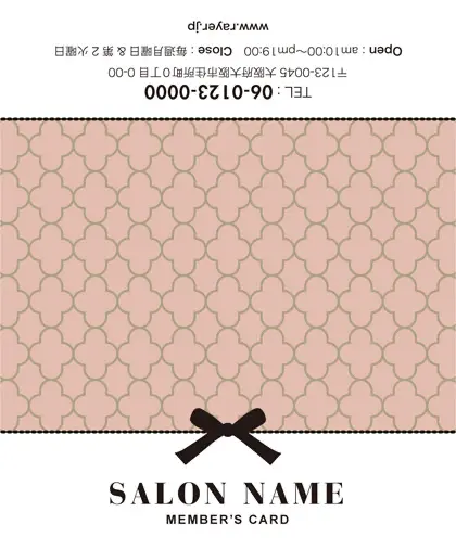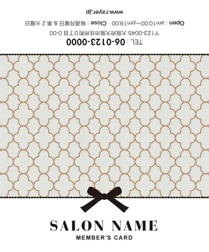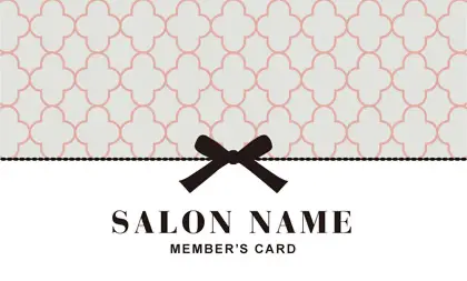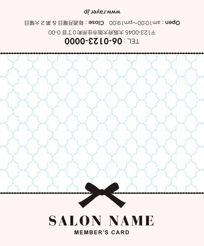 美容室・ネイルサロン・エステサロン・まつエクサロン・リラクゼーション向けの2折ポイントカード。 ガーリーでかわいいデザインの中に、大人コンサバ風のエレガンスが漂う、美容室、ネイルサロン、エステサロン向けのおしゃれな2折ポイントカードが完成しました。 幾何学的でクラシックなパターンに、可愛いリボンがアクセント。デザインのキーワードは、幾何学、パターン、クラシック、リボン。可愛さと上品さが見事に調和した2折ポイントカードで、お客様に特別感を提供します。